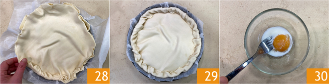 Sele as bordas torcendo a massa sobre si mesma 28 29. Em uma tigelinha, misture a gema com o leite 30.