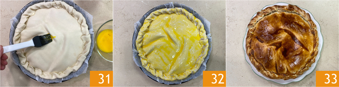 Pincele a superfície e as bordas da torta com a mistura obtida 31. Asse em forno convencional preaquecido a 200° por cerca de 50 minutos. Quando estiver dourada, retire do forno e deixe amornar. Sua torta pasqualina fácil está pronta para ser servida 33!