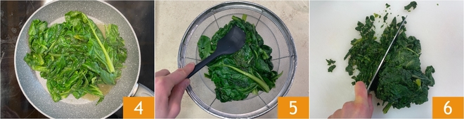 Cozinhe em fogo médio por cerca de 10–15 minutos, só o tempo de murcharem 4. Coloque as acelgas em uma peneira e aperte bem para eliminar o excesso de água 5; assim a massa folhada permanecerá crocante. Por fim, pique bem com a faca 6.