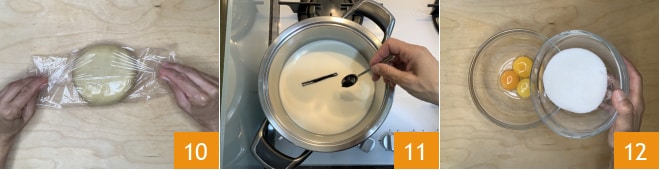 e envolva-o em filme plástico para alimentos 10. Transfira para a geladeira por pelo menos 30 minutos. Enquanto isso, prepare o creme de confeiteiro. Coloque para aquecer em uma panela o leite com a fava e as sementes de baunilha 11. Enquanto isso, despeje em uma tigela 3 gemas, o açúcar 12