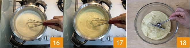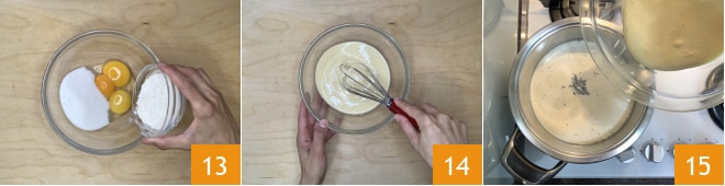 e a farinha 13. Com a ajuda de um batedor, bata bem para obter uma mistura incorporada e ligeiramente batida 14. Quando o leite estiver prestes a ferver, desligue, despeje as gemas batidas com o açúcar e a farinha 15