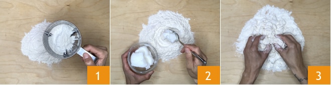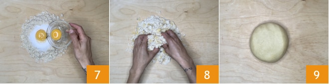 e duas gemas 7. Amasse então com as mãos 8, depois, quando obtiver uma mistura homogênea, forme um bloco 9