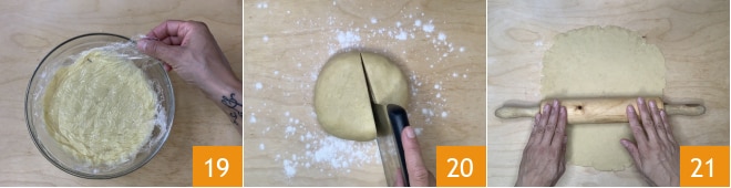 cubra com filme plástico em contato 19 e deixe esfriar. Quando o creme estiver à temperatura ambiente e a massa tiver descansado, pegue o bloco de massa, separe um terço e reserve. Pegue a parte maior e estenda com a ajuda de um rolo 23, você deve obter um disco de 24 cm, com cerca de 1 cm de espessura.