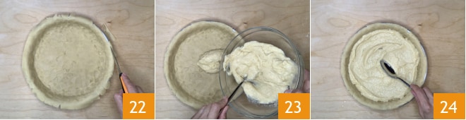 Use a massa para forrar uma forma redonda de 20 cm, sendo maior você não terá dificuldades em cobrir bem também as bordas. Com a ajuda de uma faquinha, elimine a parte de massa em excesso que sai da forma 22. Despeje o creme de confeiteiro dentro 23 e nivele com as costas de uma colher.
