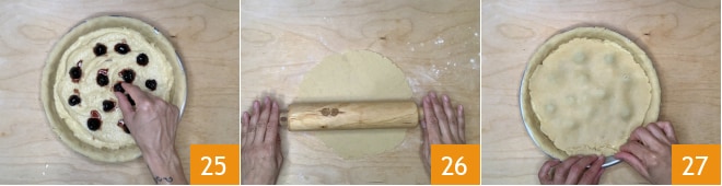 Disponha então as cerejas em calda, espaçando-as entre si 25. Pegue a massa reservada e estenda-a para formar um disco de 18 cm e 1 cm de espessura. Coloque-o no centro da torta e dobre sobre ele as bordas da camada inferior, selando-as com os dedos 27.