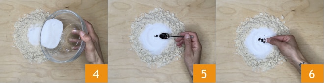 Forme novamente o vulcão e no centro despeje o açúcar 4, as sementes da meia fava de baunilha, uma pitada de sal 6