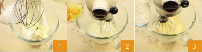 Para preparar o bolo invertido de pêssegos e amaretti, coloque na tigela de uma batedeira com batedor de arame a manteiga amolecida em pedaços e o açúcar 1, ligue a batedeira para misturar os ingredientes e obter um creme, em seguida, adicione os ovos 2, as sementes da fava de baunilha, a farinha e o fermento peneirados 3.