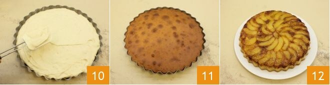 Neste ponto, despeje sobre os pêssegos a massa do bolo, nivele com uma espátula 10 e asse no forno estático a 180° por 45 minutos (ou no forno ventilado a 160° por 35 minutos). Após o cozimento, retire do forno 11, deixe esfriar e depois vire sobre um prato de servir. O seu bolo invertido de pêssegos e amaretti está pronto para ser saboreado 12!