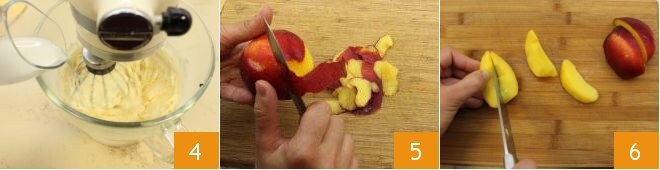 Adicione o leite em fio 4 enquanto a máquina está em funcionamento. Lave, descasque os pêssegos 5 e corte-os em fatias 6.