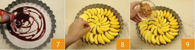 Distribua o caramelo no fundo de uma forma de 28 cm de diâmetro com borda ondulada 7, unte e enfarinhe levemente a borda ondulada antes de colocar as fatias de pêssego em um padrão de raio na forma 8 e depois polvilhe a superfície com os amaretti triturados 9.