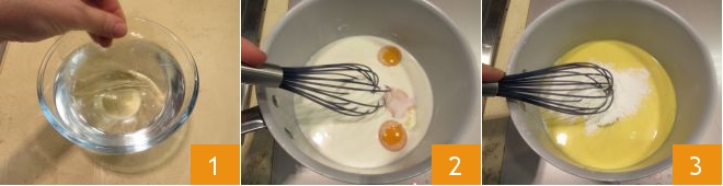 Prepare também o creme de confeiteiro clássico. Coloque as folhas de gelatina de molho em uma tigela cheia de água bem fria 1 e deixe amolecer por 10 minutos. Despeje em uma panela o creme de leite, o leite 2 e as gemas 3.