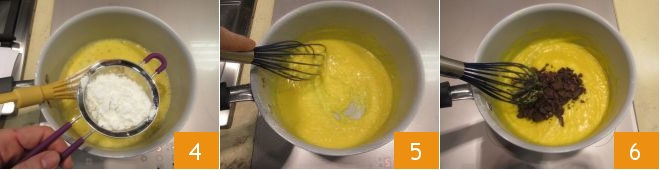 Então misture com um batedor, adicionando também o amido de milho peneirado 4. Acenda o fogo e deixe engrossar sempre mexendo 5, depois retire a panela do fogo e adicione o chocolate picado 6.
