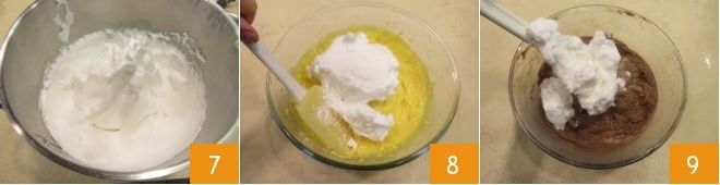 Junte as gemas com a parte restante do açúcar 4 e bata também com um batedor 5, até obter uma massa volumosa e de cor amarela clara. Delicadamente, junte as gemas batidas às claras 6,