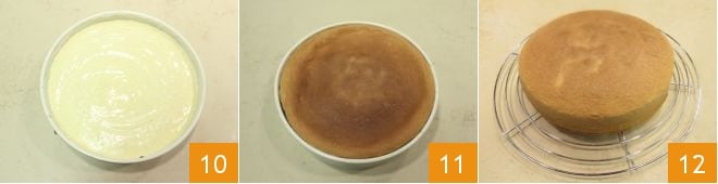 Asse em forno estático pré-aquecido a 180° por cerca de 25 minutos (se usar forno ventilado, asse a 160° por cerca de 20 minutos). Uma vez que o disco esteja bem dourado, retire do forno 7 e deixe esfriar em uma grade 8. Pegue o pão de ló, já frio, corte-o ao meio para obter 2 camadas 9.
