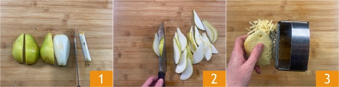 Para preparar a torta salgada de peras e gorgonzola, como primeiro passo corte as peras em quartos 1, retire o miolo e faça fatias finas 2 de cerca de 2-3 mm de espessura. Rale o queijo fontina 3, pique grosseiramente as avelãs e deixe de lado.