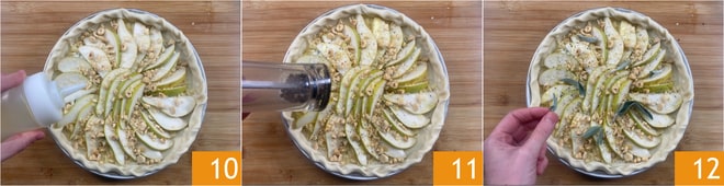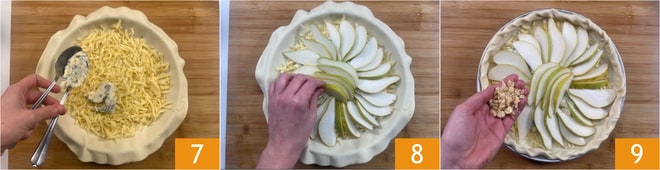 Adicione 5-6 colheradas de gorgonzola 7, em seguida disponha as fatias de pera em forma de leque e feche também o centro 8. Enrole a borda em formato de cordão. Na superfície distribua as avelãs picadas 9.