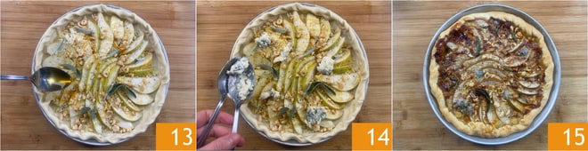 Complete com mel de castanha 13 e mais um pouco de gorgonzola 14. Asse em forno estático, na grade central, a 200°C por 30 minutos, até dourar. Deixe esfriar um pouco e sua torta salgada de peras e gorgonzola está pronta para ser saboreada 15.