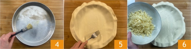 Unte uma forma redonda de 26 cm de diâmetro 4. Forre-a com a massa folhada e fure o fundo com os dentes de um garfo 5. Cubra o fundo com o queijo fontina 6.
