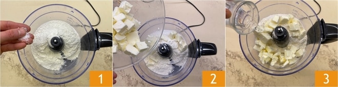 Para preparar a torta salgada com presunto e queijo, comece pela massa brisée: em um processador, coloque a farinha e uma pitada de sal 1. Adicione a manteiga fria cortada em pedaços 2, depois acrescente a água fria 3.