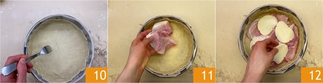 Fure a base com um garfo 10 e distribua uma primeira camada de presunto 11, depois continue com uma segunda camada de queijo em fatias 12.
