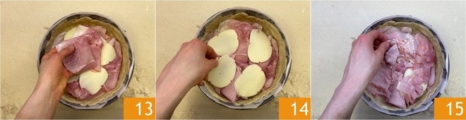 Adicione uma segunda camada de presunto 13 e de queijo 14, depois termine com uma última camada apenas de presunto 15.