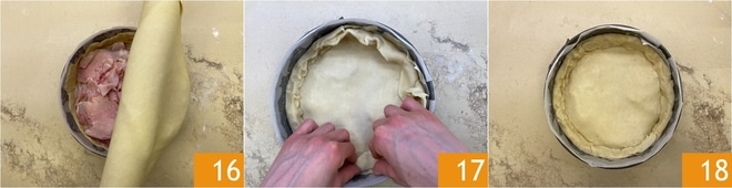 Agora, cubra a torta com a segunda camada de massa brisée 16. Una as bordas das duas massas e dobre-as para dentro 17 para criar uma espécie de cordão ao redor da borda 18.
