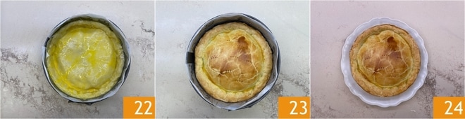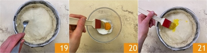 Fure também a superfície com um garfo 19. Em uma tigela, misture leite e gema de ovo 20 e pincele a torta com essa emulsão 21.