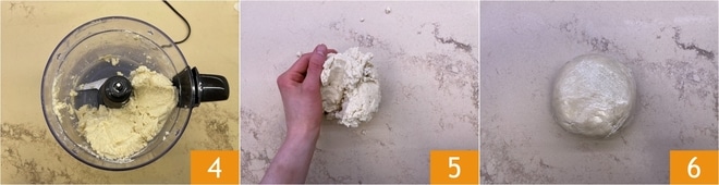 Ligue o processador para misturar rapidamente os ingredientes 4, depois transfira a mistura para uma superfície e amasse à mão 5 para formar uma massa homogênea. Embrulhe a massa em filme plástico 6 e deixe descansar por uma hora na geladeira.