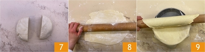 Retire a massa da geladeira e divida-a ao meio 7. Forre com papel manteiga uma forma de 22 cm de diâmetro com fundo removível. Abra as duas porções de massa com o rolo até um diâmetro de 25-26 cm 8. Enrole a massa brisée no rolo e desenrole sobre a forma 9.