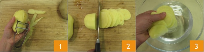 Para preparar a torta salgada com batatas e mortadela, comece descascando as batatas 1. Corte-as em rodelas de 3-4 mm 2 e depois mergulhe em uma tigela com água fria, reserve 3.