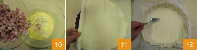 Adicione também o queijo e a mortadela cortados em cubinhos 10, misture. Desenrole a massa folhada, mantendo o papel manteiga, dentro de uma forma canelada (cuja base tem 26 cm e a superfície 28 cm) 11. Fure a base com um garfo 12.