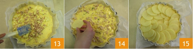 Despeje o recheio e distribua os cubinhos 13. Escorra as batatas e distribua na superfície formando primeiro um círculo 14 e abaixo dele disponha as outras fatias ainda em forma de círculo 15.