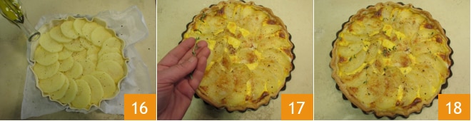 Enfeite a superfície com óleo 16, sal, pimenta e, por fim, o queijo ralado. Asse a 180°, em forno estático já aquecido, por 60 minutos na prateleira baixa. Deixe a torta salgada com batatas e mortadela esfriar um pouco antes de adicionar mais um pouco de tomilho 17 e servir 18.