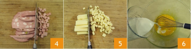 Corte a mortadela em cubinhos 4 e o queijo 5. Em uma tigela, misture os ovos com o creme de leite 6.