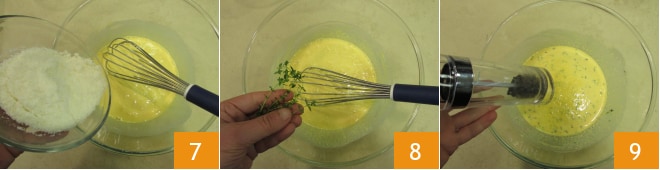 Adicione o queijo pecorino ralado 7, as folhas de tomilho 8, sal e pimenta 9.