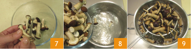 Enquanto isso, leve uma panela de água para ferver e limpe os cogumelos removendo a parte terrosa do caule e raspando delicadamente com uma faquinha 7. Ferva os cogumelos por 10 minutos 8, eliminando a espuma que se formar na superfície com uma escumadeira. Depois de escaldá-los, escorra os chiodini 9 e deixe esfriar.