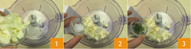 Para preparar a torta salgada com cogumelos chiodini, primeiro prepare a massa salgada: em um processador com lâminas de aço, coloque a farinha e a manteiga fria da geladeira 1, depois adicione o sal grosso 2 e o tomilho 3.