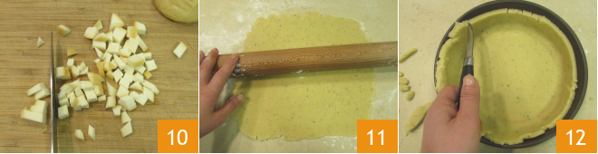 Corte o queijo scamorza em cubos 10. Após o tempo de descanso, abra a massa em uma superfície levemente enfarinhada até alcançar a espessura de 5-6 mm 11 e forre uma forma com diâmetro de 20 cm na base e 22 cm na superfície, removendo o excesso de massa com uma faca 12.