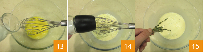Passe ao recheio: bata os ovos em uma tigela, depois adicione o creme de leite 13, o sal 14, a pimenta e o tomilho 15.