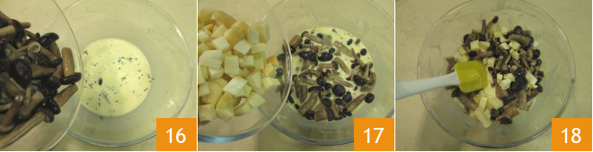 Adicione também os cogumelos 16 e os cubos de queijo scamorza 17, depois misture bem para homogeneizar tudo 18.