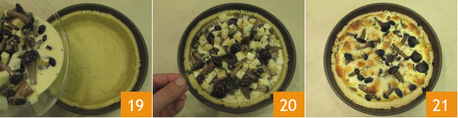 Despeje a mistura obtida na forma 19, aromatize novamente com algumas folhinhas de tomilho 20 e asse em forno estático pré-aquecido a 200° por 30 minutos, depois abaixe a temperatura para 180° e asse por mais 10 minutos. Sua torta salgada com cogumelos chiodini está pronta para ser saboreada 21!