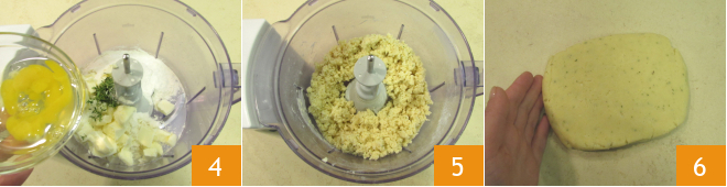 Adicione também o ovo 4 e processe até obter uma mistura esfarelada 5. Transfira a mistura para uma superfície e trabalhe rapidamente com as mãos para formar um bloco 6. Envolva o bloco em filme plástico e deixe descansar na geladeira por pelo menos uma hora.