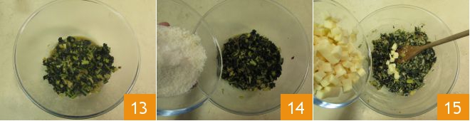Depois de decorrido o tempo, transfira a mistura para uma bacia e deixe esfriar completamente 13 antes de adicionar o queijo ralado 14, em seguida, o edamer cortado em cubos de cerca de 1 cm 15,