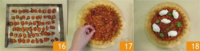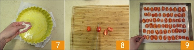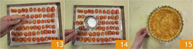 e polvilhe a base com queijo Grana ralado 7. Asse em forno estático pré-aquecido a 180° por cerca de 30 minutos. Enquanto a massa folhada está no forno, prepare os tomatinhos confit. Primeiro, lave-os e seque-os. Coloque-os em uma tábua e corte-os ao meio 8. Disponha-os gradualmente em uma assadeira com papel manteiga, com o lado cortado voltado para cima 9
