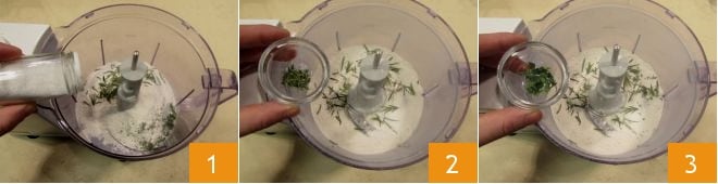 Para preparar a torta salgada de batatas, cebolas e queijo, comece com a Massa brisée. Coloque a farinha peneirada junto com as folhinhas de alecrim em um processador com lâminas. Ajuste o sal 1 e a pimenta e adicione o tomilho 2 e a manjerona 3.