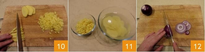Descasque as batatas e corte 200 g em cubos de 3-4 mm e 300 g em fatias finas de 2 mm 10, em seguida mergulhe-as em água fria para evitar que escureçam 11. Corte as cebolas em rodelas 12 e refogue em uma frigideira ampla com o óleo por 2 minutos em fogo moderado, reservando algumas.