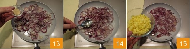 Adicione também o açúcar mascavo 13, cozinhe por mais 2 minutos, despejando o Caldo de legumes (como alternativa, você pode usar a mesma quantidade de água) 14, depois adicione as batatas previamente cortadas em cubos 15.