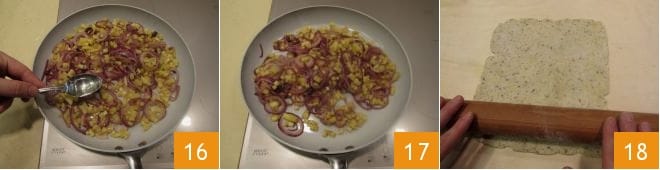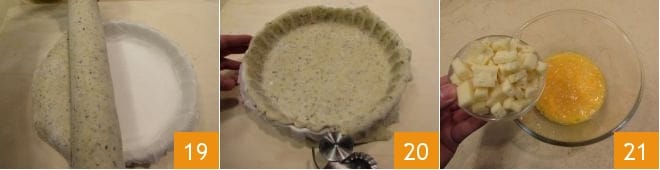 Cozinhe tudo por pelo menos 15 minutos sempre em fogo moderado, ajustando o sal e a pimenta e adicionando mais 2 colheres de sopa de caldo de legumes ou água 16. Uma vez pronto 17, desligue o fogo e coloque o recheio em uma tigela para esfriar. Após o tempo necessário, retire a massa brisée da geladeira, coloque-a em uma superfície de trabalho levemente enfarinhada e com um rolo estenda-a 18 em uma folha com espessura de 1-2 mm e diâmetro de 29 cm.
