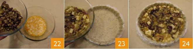 Adicione também o recheio que você preparou 22, misturando bem com um garfo para incorporar bem todos os ingredientes, depois despeje tudo na forma de torta 23, distribuindo de maneira uniforme 24.
