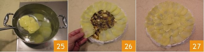 Escalde as batatas por 20 segundos em água quente salgada, escorra-as 25 e coloque-as em água fria para que liberem o amido. Escorra-as cuidadosamente e coloque-as em formato de leque em sentido circular 26, começando pelo círculo mais externo e cobrindo todo o recheio 27.